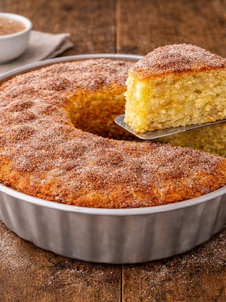 Despeje a massa na forma preparada e alise a superfície. Em uma tigelinha separada, misture o açúcar com a canela e polvilhe sobre a massa crua. Leve ao forno por 35 a 45 minutos, ou até que esteja dourado e um palito inserido no centro saia limpo. Após assar, deixe o bolo esfriar um pouco antes de desenformar.